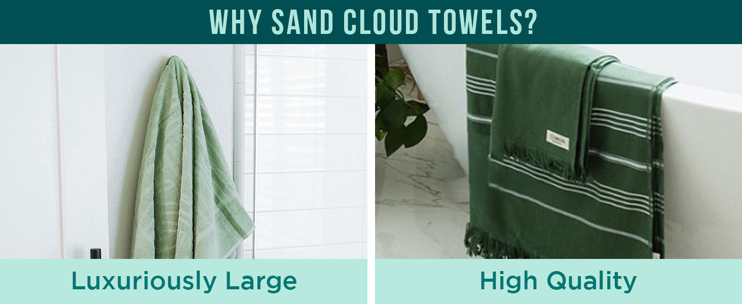 - Lightweight Organic Cotton Bath Bundle: Elevate your bathroom with the Sand Cloud Classic XL Bath Bundle. Includes 2 bath towels (36” x 67”) and 2 hand towels (18” x 30”). These towels are single-ply and piece-dyed. Green color.